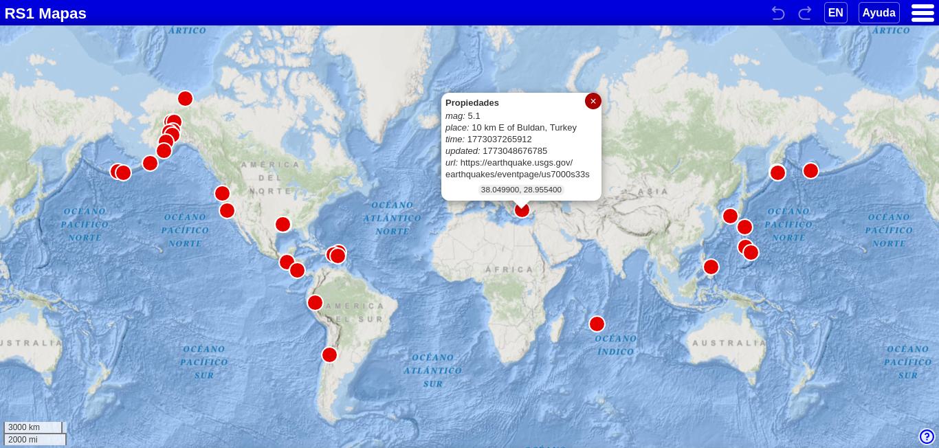 Este mapa carga un archivo GeoJSON desde la página del USGS para mostrar los terremotos relevantes más recientes.
